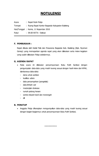 Contoh notulen rapat umumnya dibagikan seorang notulis kepada seluruh anggota rapat. Biasanya yang termasuk dalam notulen rapat ini mulai dari hari tanggal tempat waktu daftar peserta isi rapat kesimpulan dan tanda tangan dari perserta maupun pemimpin rapat.