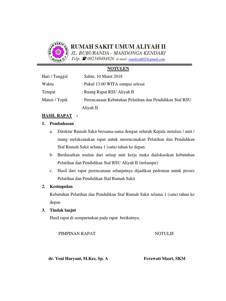 Contoh Notulen Rapat Akreditasi. Notulen rapat merupakan sebuah catatan yang berisi rangkuman dari suatu rapat yang ditulis oleh seorang notulis. JADWAL TRAINING MANAJEMEN DIKLAT RUMAH SAKIT TAHUN 2022.